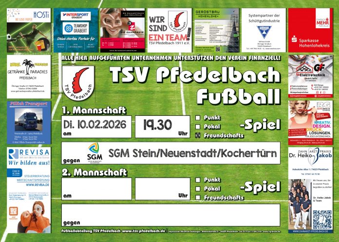 Unsere 1. Mannschaft spielt am Dienstag, den 10.02.2026 um 19.30 Uhr zu Hause auf dem Kunstrasenplatz ihr letztes Vorbereitungsspiel gegen den A2-Ligisten SGM Stein/Neuenstadt/Kochertürn.