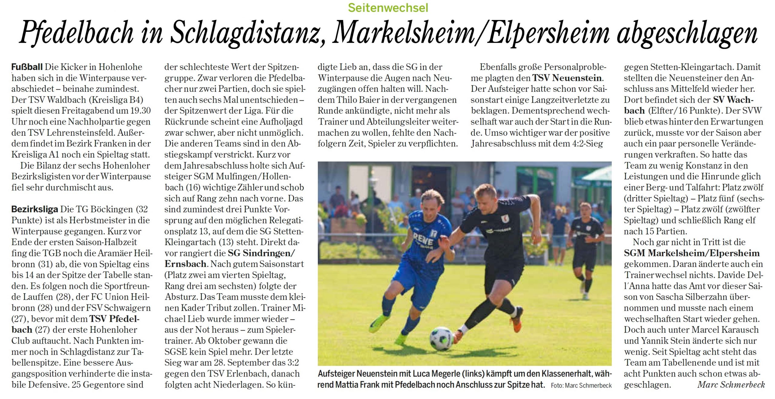 Ebenfalls große Personalprobleme plagten den TSV Neuenstein. Der Aufsteiger hatte schon vor Saisonstart einige Langzeitverletzte zu beklagen. Dementsprechend wechselhaft war auch der Start in die Runde. Umso wichtiger war der positive Jahresabschluss mit dem 4:2-Sieg gegen Stetten-Kleingartach. Damit stellten die Neuensteiner den Anschluss ans Mittelfeld wieder her. Dort befindet sich der SV Wachbach (Elfter/16 Punkte). Der SVW blieb etwas hinter den Erwartungen zurück, musste vor der Saison aber auch ein paar personelle Veränderungen verkraften. So hatte das Team zu wenig Konstanz in den Leistungen und die Hinrunde glich einer Berg- und Talfahrt: Platz zwölf (dritter Spieltag) – Platz fünf (sechster Spieltag) – Platz zwölf (zwölfter Spieltag) und schließlich Rang elf nach 15 Partien.