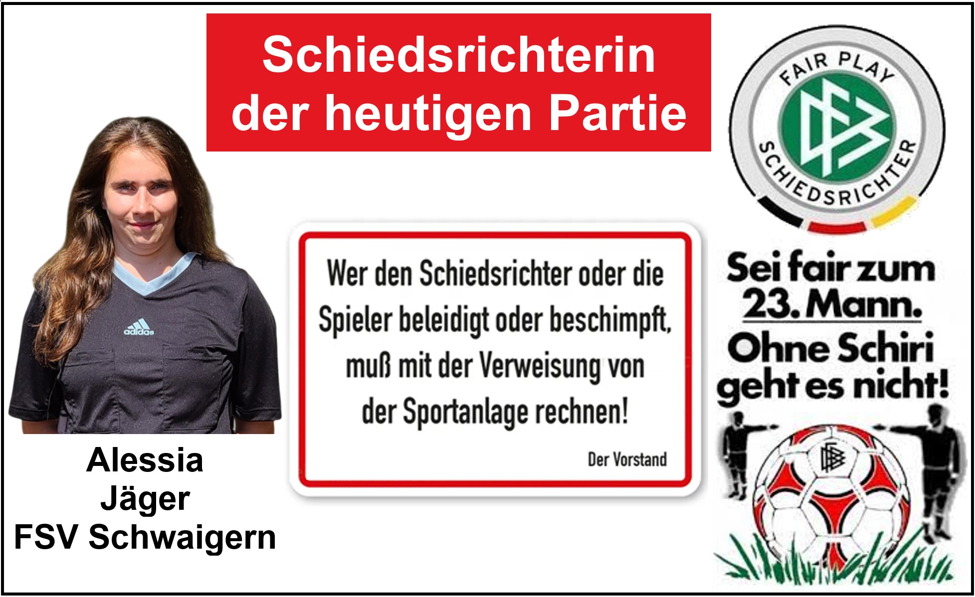 Die Schiedsrichterin der heutigen Partie, Frau Alessia Jäger vom FSV Schwaigern darf ich in Pfedelbach herzlich begrüßen Ich wünsche Ihr viel Erfolg und hoffe auf einen fairen Spielverlauf.