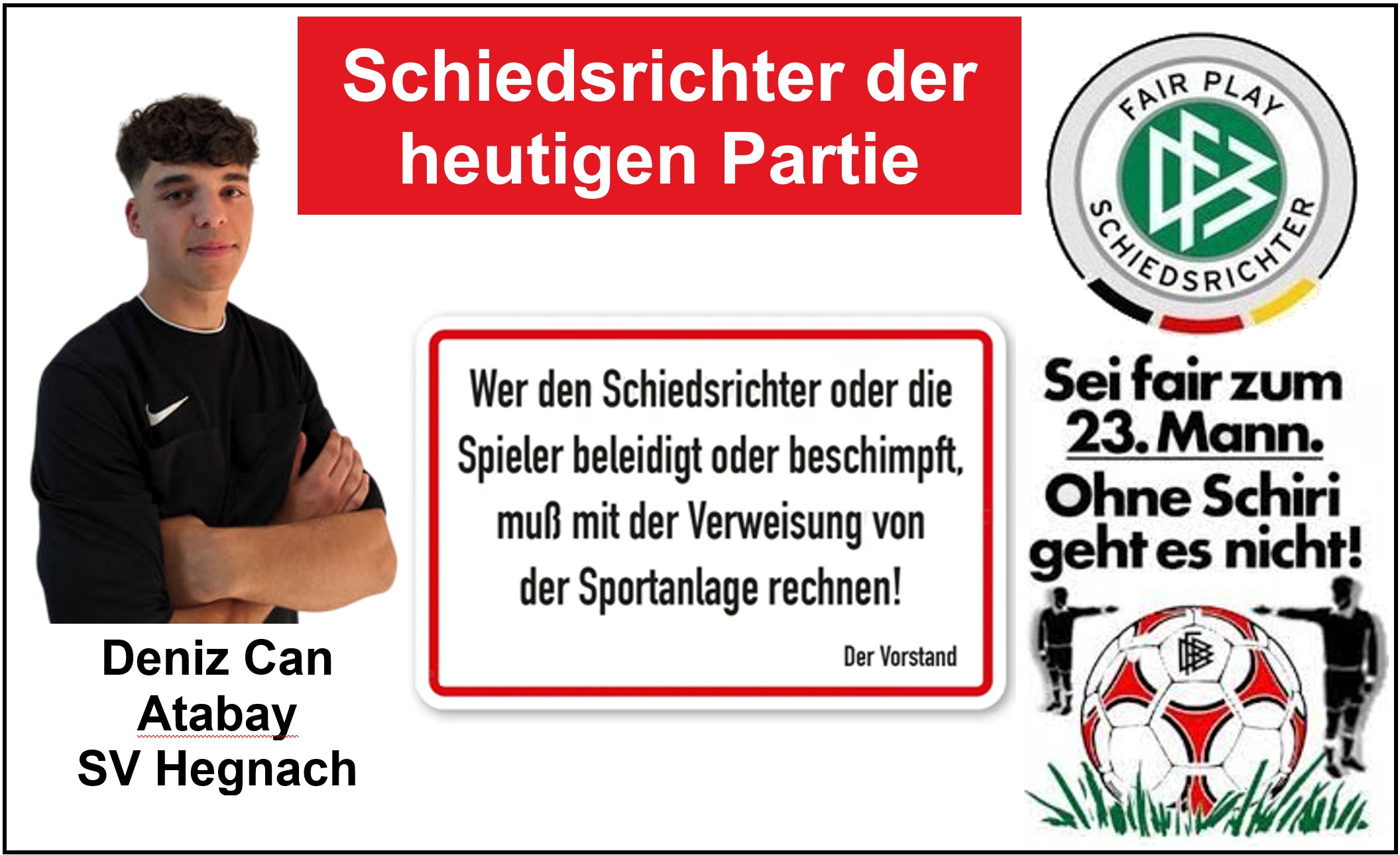 Den Schiedsrichter der heutigen Partie, Herrn Deniz Can Atabay vom SV Hegnach darf ich in Pfedelbach herzlich begrüßen Ich wünsche Ihm viel Erfolg und hoffe auf einen fairen Spielverlauf.