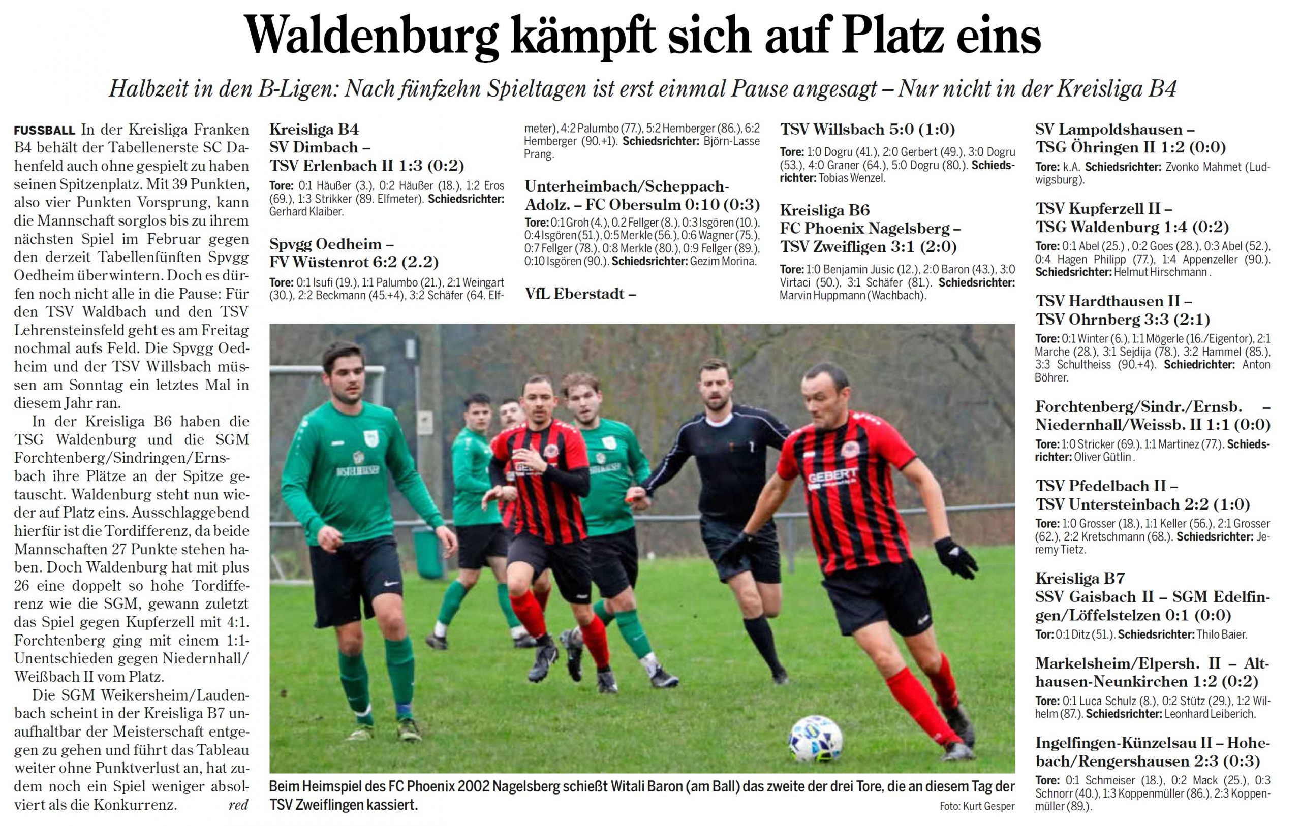 Die Pfedelbacher Zweite spielte am Samstag, den 29.11.2025 zu Hause in der Kreisliga B6 im Gemeindederby gegen den TSV Untersteinbach 2:2 Unentschieden. Beide Tore erzielte Fabian Großer.