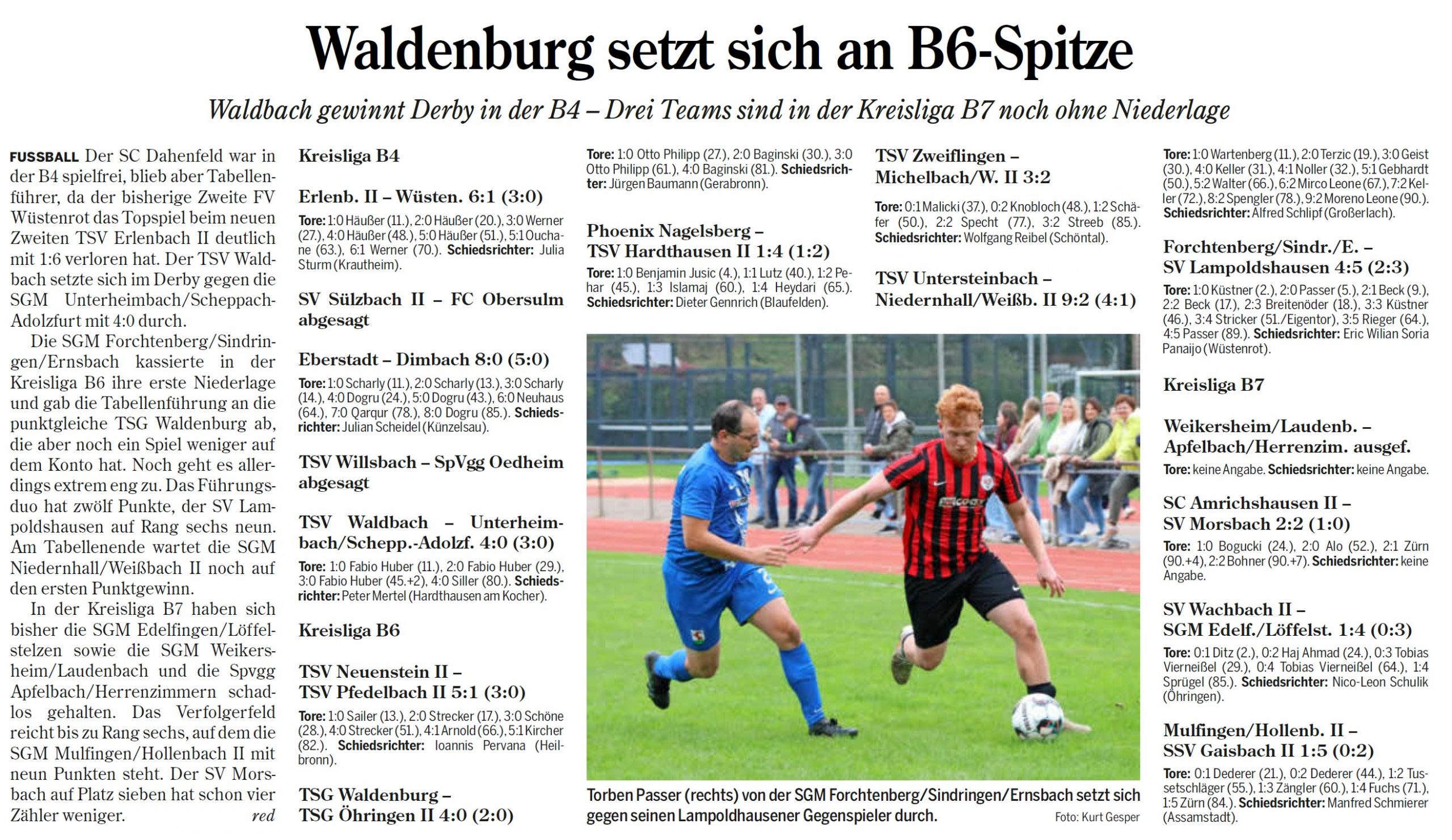Die Ergebnisse des 6. Spieltags der Kreisliga B6 Hohenlohe: