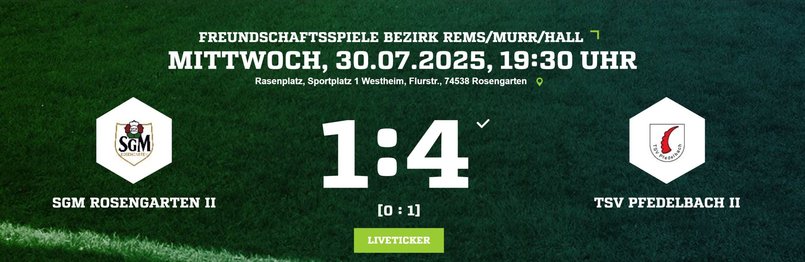 Sascha Arnold brachte Pfedelbach in der 29. Minute in Führung, die Rosengarten kurz nach Beginn der zweiten Halbzeit (49.) ausglich. Durch Tore drei späte Tore von Till Geiger (81.) und zwei Mal Noah Ostheimer (86., 90.+1) stand am Ende ein 4:1 Auswärtserfolg.