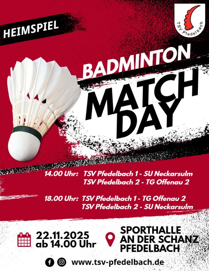 Start Aktuelles Badminton Badminton Heimspieltag am kommenden Samstag! AktuellesBadminton Badminton Heimspieltag am kommenden Samstag! 19. November 2025 Teilen FacebookTwitterWhatsAppEmailDrucken 14.00 Uhr: TSV Pfedelbach 1 – SU Neckarsulm TSV Pfedelbach 2 – TG Offenau 2 18.00 Uhr: TSV Pfedelbach 1 – TG Offenau 2 TSV Pfedelbach 2 – SU Neckarsulm Klicks: 55 Verwandte ArtikelMehr vom Autor Badminton Erfolgreicher Heimspieltag der Badmintonabteilung Pfedelbach Badminton Badminton: Bändeles-Turnier am Samstag, den 10. Januar 2026 Badminton Badminton: 45 Teilnehmer:innen beim Bändeles-Turnier Kommentieren Sie den Artikel Antwort abbrechenLoggen Sie sich ein, um einen Kommentar abzugeben