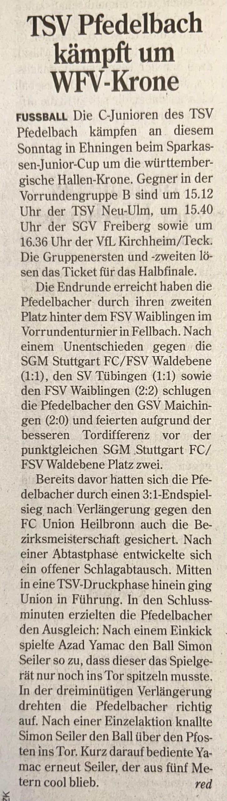 Die C-Junioren des Jugendteam TSV kämpfen an diesem Sonntag in Ehningen beim Sparkassen-Junior-Cup um die württembergische Hallenkrone. Gegner in der Vorrundengruppe B sind um 15.12 Uhr der TSV Neu-Ulm, um 15.40 Uhr der SGV Freiberg sowie um 16.36 Uhr der VfL Kirchheim/Teck. Die Gruppenersten und -zweiten lösen das Ticket für das Halbfinale. Die Endrunde erreicht hat die Spielgemeinschaft aus Pfedelbach und Untersteinbach durch ihren zweiten Platz hinter dem FSV Waiblingen im Vorrundenturnier in Fellbach. Nach einem Unentschieden gegen die SGM Stuttgart FC/FSV Waldebene (1:1), den SV Tübingen (1:1) sowie den FSV Waiblingen (2:2) schlug das Jugendteam TSV den GSV Maichingen (2:0) und VfL Pfullingen (3:1) und feierten aufgrund der besseren Tordifferenz vor der punktgleichen SGM Stuttgart FC/ FSV Waldebene Platz zwei. Bereits davor hatt sich das Jugendteam TSV durch einen 3:1-Endspielsieg nach Verlängerung gegen den FC Union Heilbronn auch die Bezirksmeisterschaft gesichert. Nach einer Abtastphase entwickelte sich ein offener Schlagabtausch. Mitten in eine TSV-Druckphase hinein ging Union in Führung. In den Schlussminuten erzielte das Jugendteam TSV den Ausgleich: Nach einem Einkick spielte Azad Yamac den Ball Simon Seiler so zu, dass dieser das Spielgerät nur noch ins Tor spitzeln musste. In der dreiminütigen Verlängerung drehten die Pfedelbacher richtig auf. Nach einer Einzelaktion knallte Simon Seiler den Ball über den Pfosten ins Tor. Kurz darauf bediente Yamac erneut Seiler, der aus fünf Metern cool blieb.