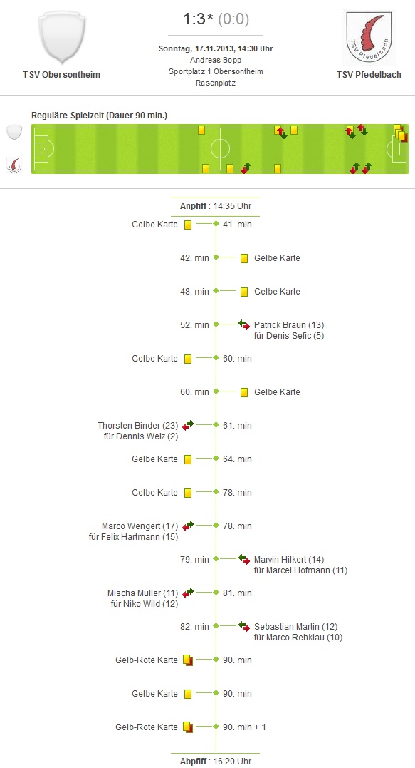 Beim Stand von 0:0 wurden die Seiten gewechselt. Bei besserer Chancenauswertung hätte die Heimelf zu diesem Zeitpunkt bereits 3 Tore erzielen können. Nach der Pause wurde Pfedelbacher immer stärker und konnte in der 57. Spielminute durch Rehklau die Führung markieren. Obersontheim setzte nun nochmals alles daran, die drohende Niederlage noch abzuwenden. Es entwickelte sich ein offener Schlagabtausch mit Chancen auf beiden Seiten. In der 75. Spielminute die Vorentscheidung durch Eberhardt, der zum 0:2 einnetzte. Nur 5 Minuten später war wiederum Marco Rehklau zu Stelle und hämmerte den Ball aus kurzer Distanz zwischen die Maschen. Kurz vor dem Ende entschied der Unparteiische nach Foulspiel auf Strafstoß für die Heimelf. Diese verwandelten zum 1:3. Am Ende mussten noch 2 Spieler der Heimelf wegen Meckerns mit gelb–rot vom Platz.