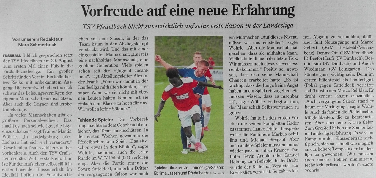 In der Hohenloher Zeitung wurde heute ein Bericht über die bevorstehende Landesliga-Saison, die für uns am Sonntag, den 20.08.2017 mit einem Heimspiel gegen den TSV Schornbach startet, veröffentlicht.