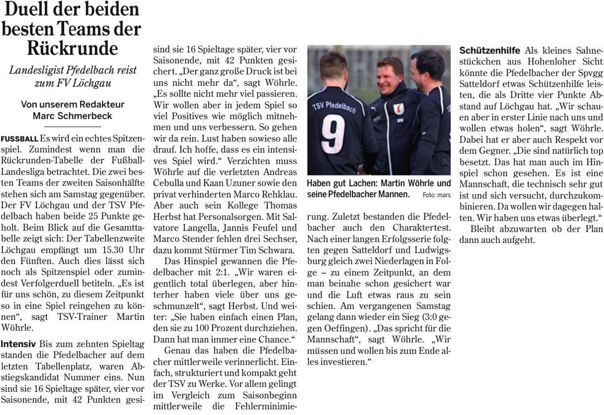 Unser TSV kann nach dem Sieg am vergangenen Wochenende gegen Oeffingen entspannt nach Löchgau fahren. Der Klassenerhalt ist so gut wie gesichert. Trotzdem möchte man aus Löchgau zumindest einen Punkt mit nach Pfedelbach bringen. Sicherlich eine große Aufgabe. Sind wir gespannt, was unser Team in Löchgau erreichen kann.
