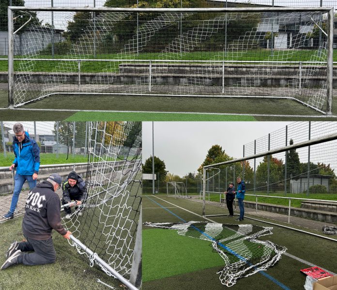 Nachdem wir vor ein paar Wochen bereits die Tornetze am Rasenplatz ausgetauscht hatten, haben wir an diesem Samstag, den 27.09.2025 die alten und kaputten Tornetze von den Toren am Kunstrasenplatz entfernt und neue schwarz/weiße Tornetze auf die Tore montiert.