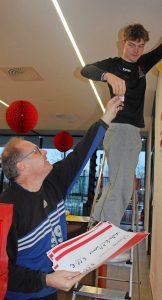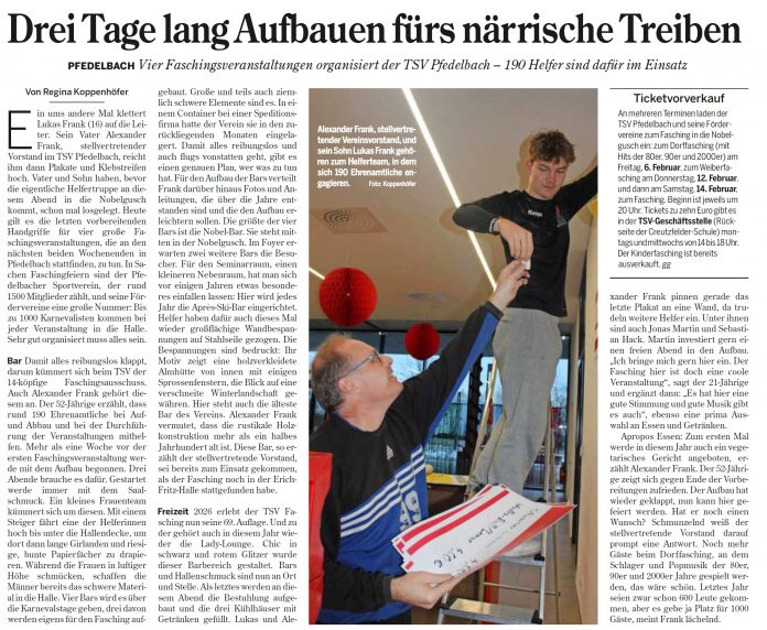 Ein ums andere Mal klettert Lukas Frank (16) auf die Leiter. Sein Vater Alexander Frank, stellvertretender Vorstand im TSV Pfedelbach, reicht ihm dann Plakate und Klebstreifen hoch. Vater und Sohn haben, bevor die eigentliche Helfertruppe an diesem Abend in die Nobelgusch kommt, schon mal losgelegt. Heute gilt es die letzten vorbereitenden Handgriffe für vier große Faschingsveranstaltungen, die an den nächsten beiden Wochenenden in Pfedelbach stattfinden, zu tun. In Sachen Faschingfeiern sind der Pfedelbacher Sportverein, der rund 1500 Mitglieder zählt, und seine Fördervereine eine große Nummer: Bis zu 1000 Karnevalisten kommen bei jeder Veranstaltung in die Halle. Sehr gut organisiert muss alles sein.