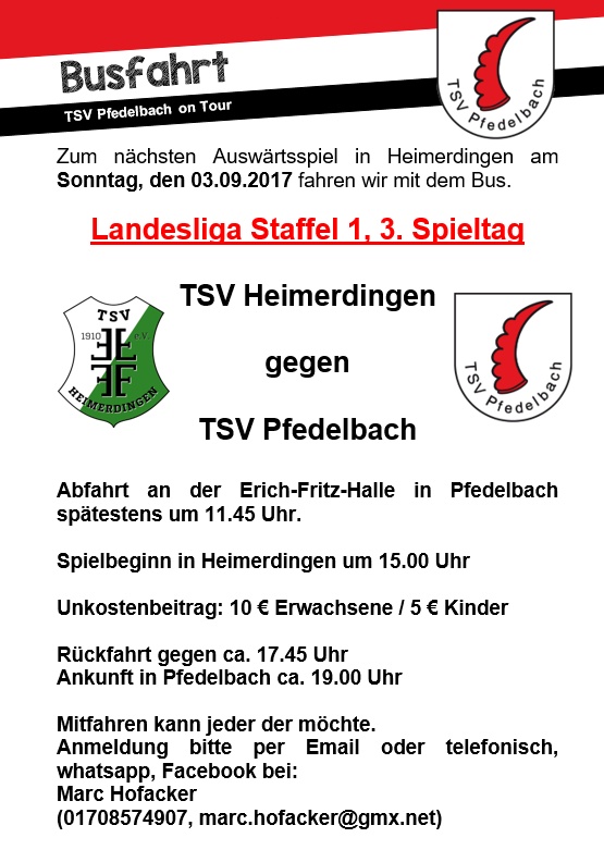 Am Sonntag, den 3. September 2017 spielen wir auswärts beim TSV Heimerdingen aus dem Enz-Murr-Kreis. Zu diesem Spiel wird ein Bus eingesetzt.