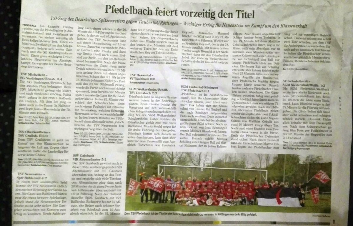 In der Folge versuchte die Heimelf noch einmal alles, zumindest einen Punkt im Taubertal zu behalten, konnte sich jedoch nicht mehr entscheidend im gegnerischen Strafraum durchsetzen. Somit blieb es am Ende bei der knappen 0:1-Heimniederlage, welche für den TSV Pfedelbach gleichzeitig die vorzeitige Meisterschaft in der Bezirksliga bedeutete.