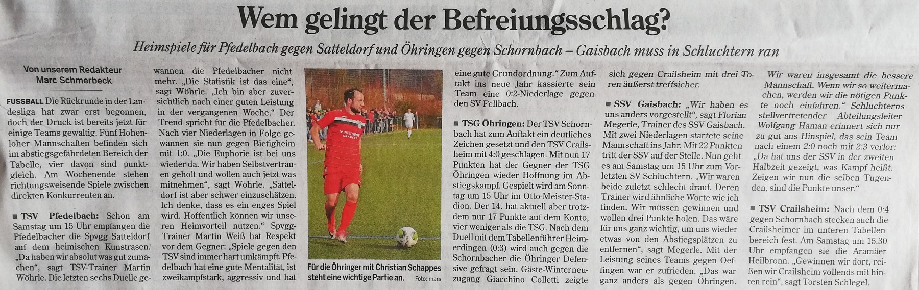 Die Fußball-Landesligisten TSV Pfedelbach und die TSG Öhringen haben am Wochenende jeweils ein Heimspiel. Der SSV Gaisbach muss beim SV Schluchtern ran.