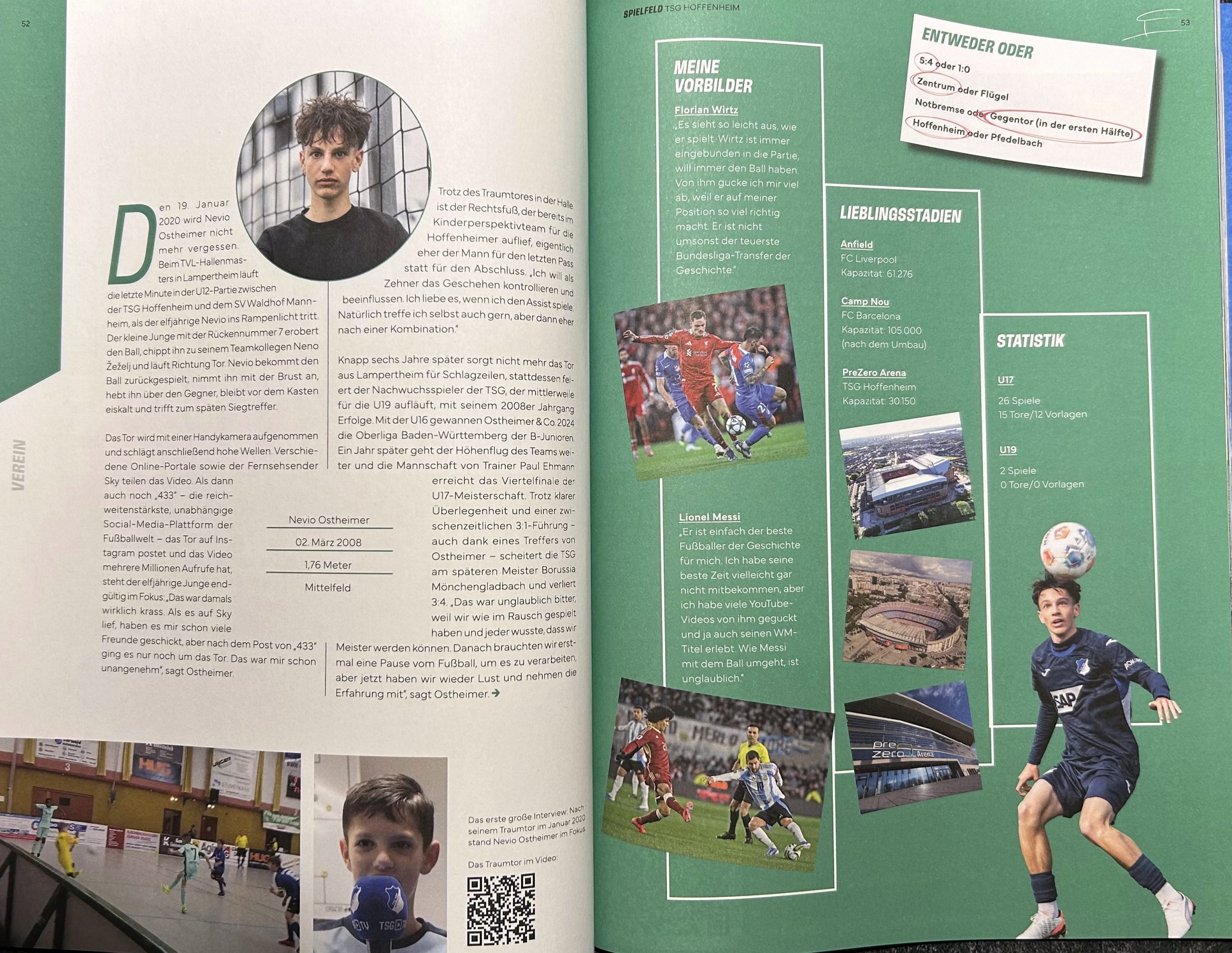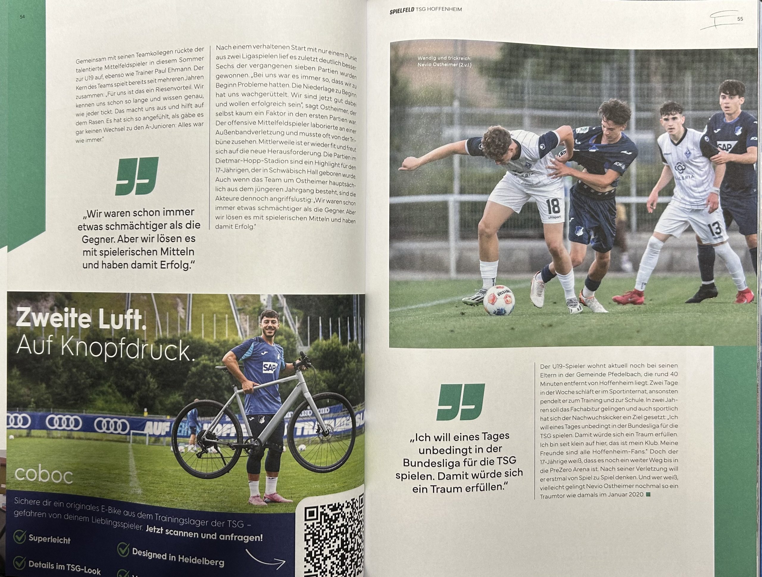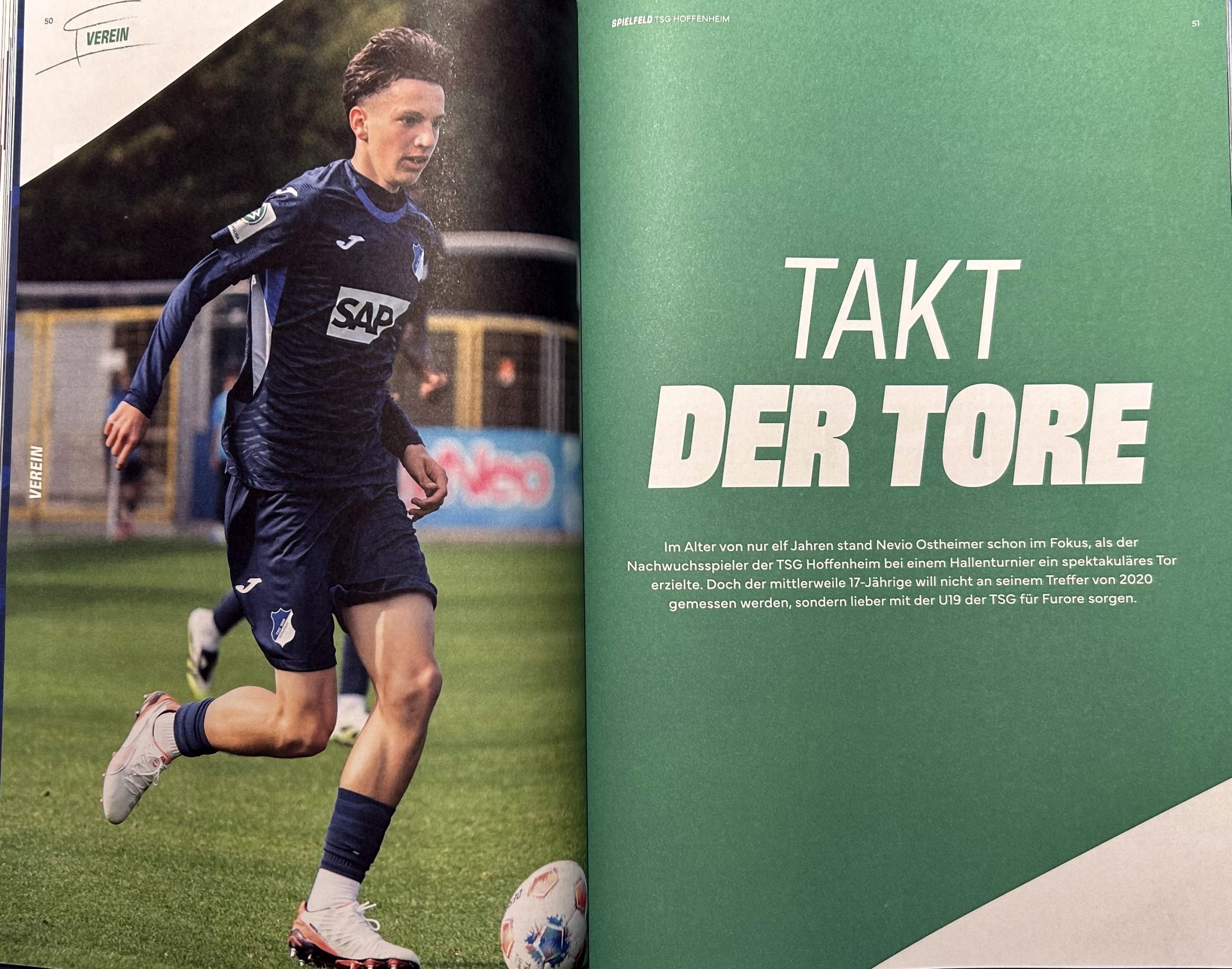 Im Oktobermagazin der TSG Hoffenheim sind gleich drei Doppelseiten über unseren ehemaligen Jugendspieler Nevio Ostheimer abgelichtet